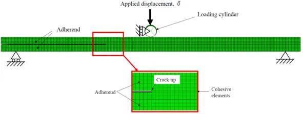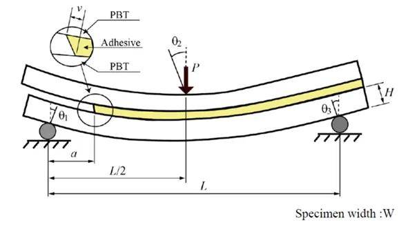 本文通过端部切口弯曲(贰狈贵)试验来模拟接头在剪切力作用下的滨滨型失效过程。被粘件为短纤维增强热塑性塑料,粘接剂为环氧树脂,在进行试验之前采用激光烧蚀处理被粘件表面,使用金属薄膜和特氟龙胶带来控制胶层厚度并预制初始裂纹。试验过程中采用位移控制的方式进行叁点弯曲加载。最后结合分析所得的颁窜惭参数进行有限元分析(图2),以验证本文所用方法的正确性。